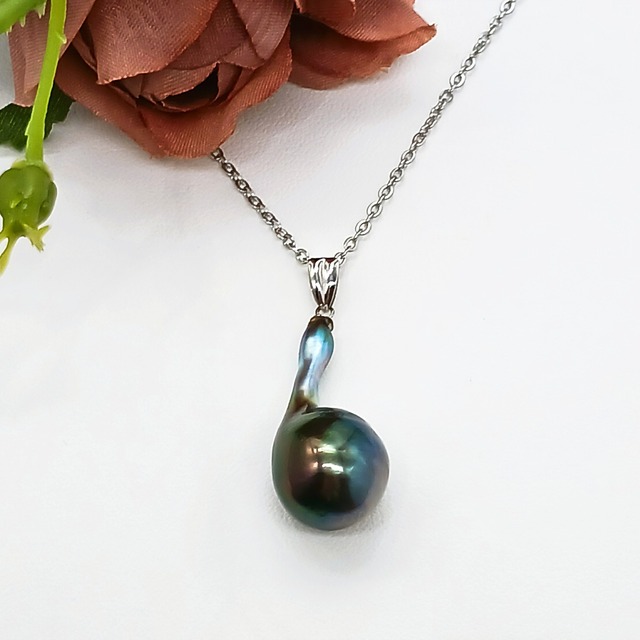 照りの良い南洋黒蝶真珠のペンダントトップです。 黒蝶真珠とは、 黒蝶貝(クロチョウガイ)という大きな2枚貝から産出される真珠です。 ほとんどが南太平洋のポリネシアのタヒチ島産です。 別名タヒチ真珠とも言われています。 写真の真珠の大きさは12、3ミリの真円 色目はグレー寄りのブラックです。 バチカンは10金イエローゴールドです。(刻印有) 小さなエクボはございますが、綺麗な真珠です。 サービスチェーンとして 丈夫で金属アレルギーの方にも優しい サージカルステンレスチェーンをお付けします。(刻印有) アジャスター付きで41センチ~47センチで装着できます。 トップは抜けますので、 お持ちのチェーンに付け替えできます。 (バチカンは3ミリ幅くらいまで通せます) 金が爆上がりする前に仕入れたバチカンで作製していますので 表示価格はたいへんお買い得です。 シンプルで飽きのこない形です。 年齢を問わず、長く使っていただきたいお品です。 写真の商品をペンダントケースにお入れして 3日以内にヤマト運輸で送らせていただきます。 お届け希望日時がございましたら、 購入時にお知らせください。 *真珠の種類…南洋黒蝶真珠 *真珠の大きさ…12、3ミリ *カラー…グレー寄りのブラック *材質…K10YG *重量…トップのみ2、8g *百貨店セール価格税込¥52,800の商品です。