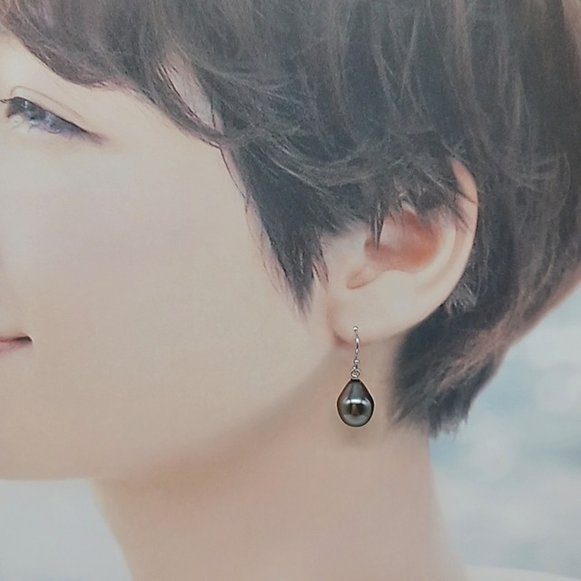 SV雫型南洋黒蝶真珠フックピアス(貫通珠)・横幅8、5ミリ (商品番号13-729)
