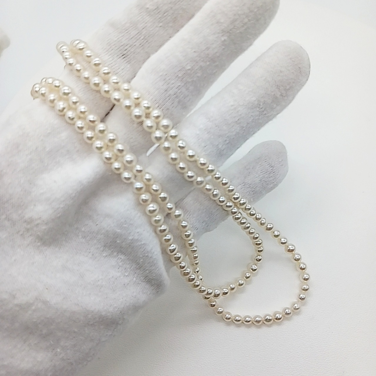 照りにこだわって仕入れた可愛いサイズの淡水真珠で作製したロングネックレスです。