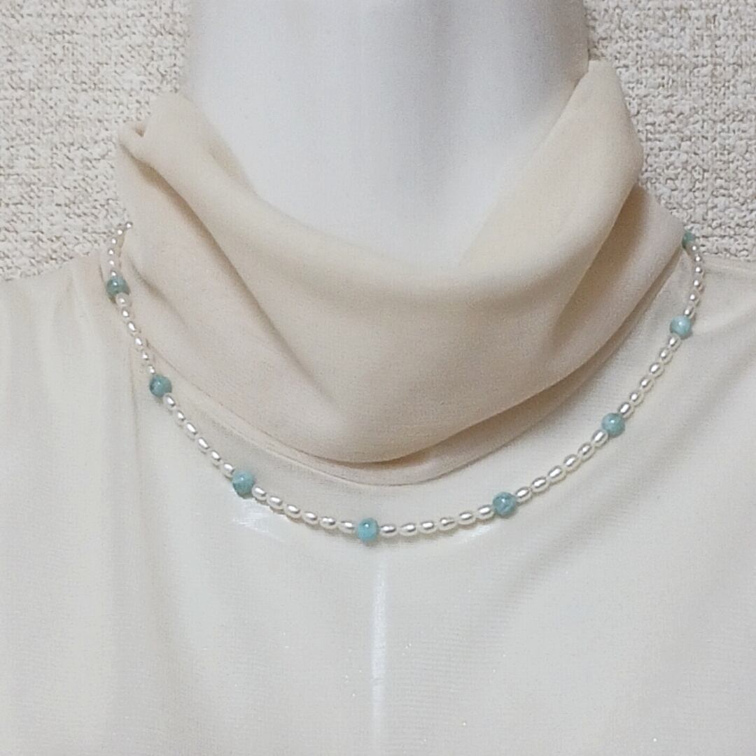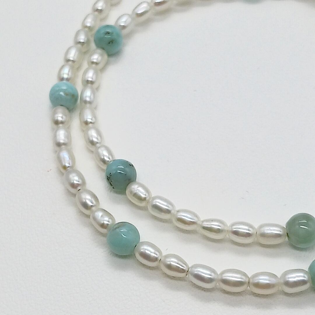 照りの良い淡水ベビー真珠に天然石のラリマーを均等に入れた、