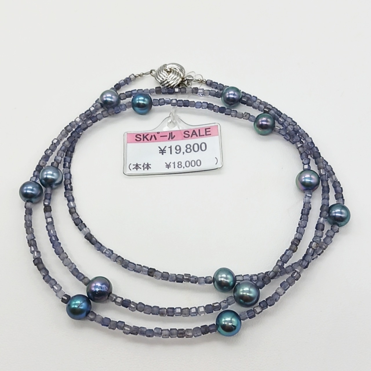 あこやグレー真珠入りアイオライトロングネックレス・7、5~8ミリ珠(商品番号12-652)