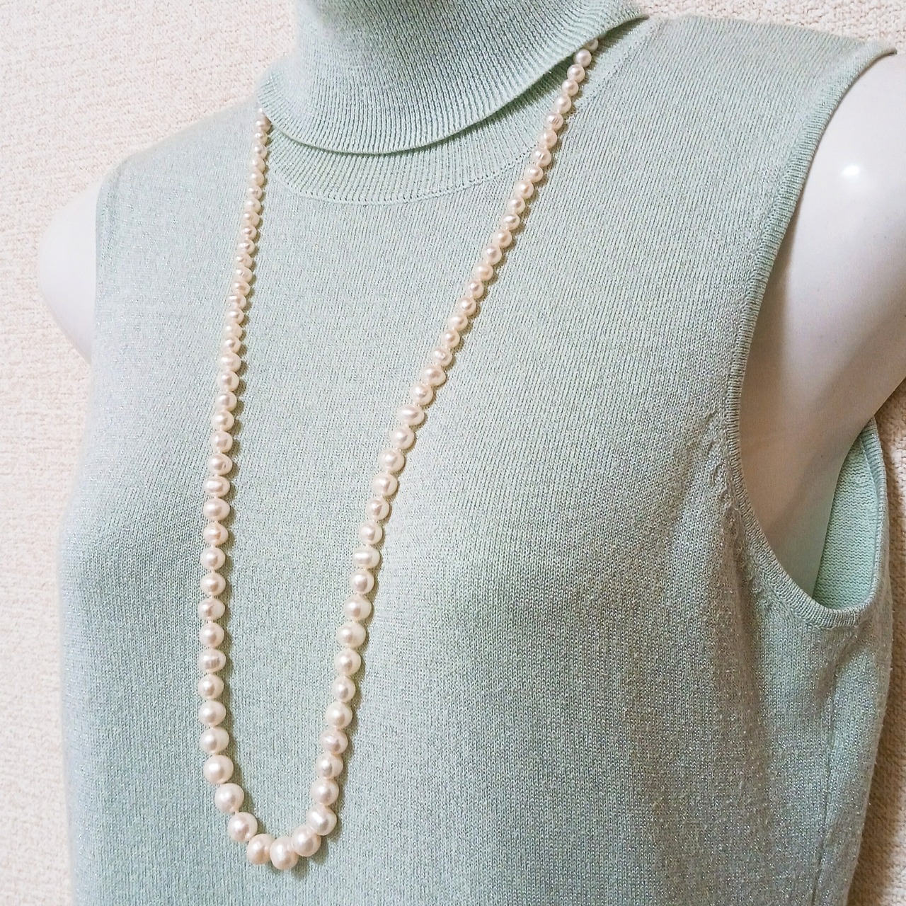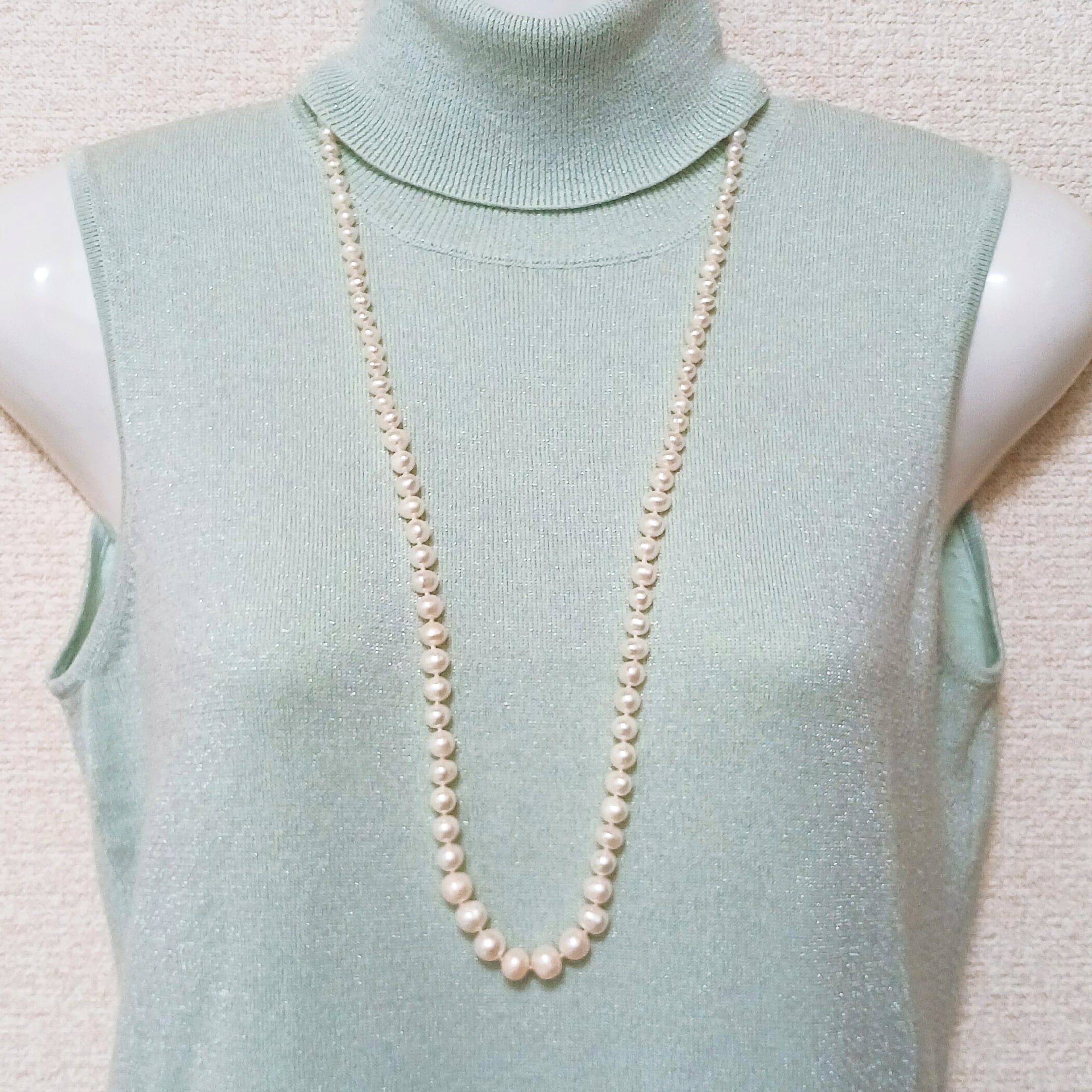 照りの良い淡水バロック真珠のロングネックレスです。
