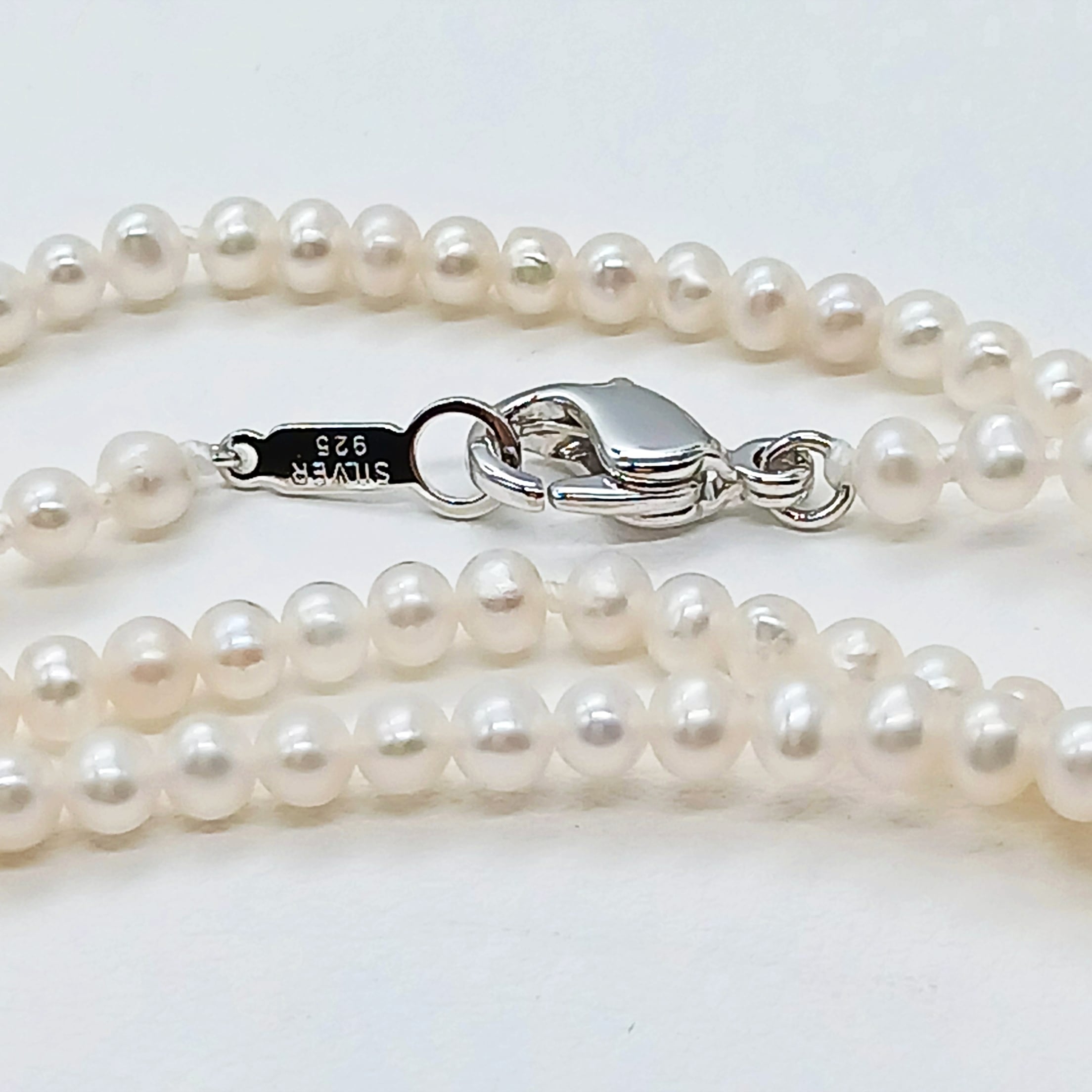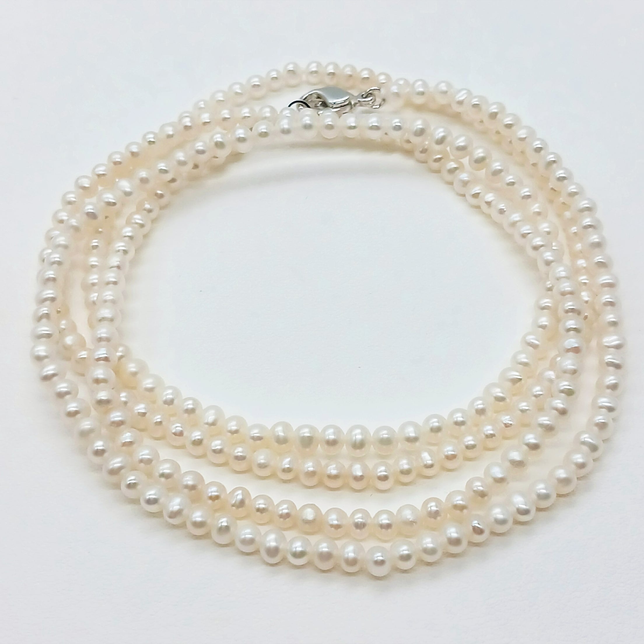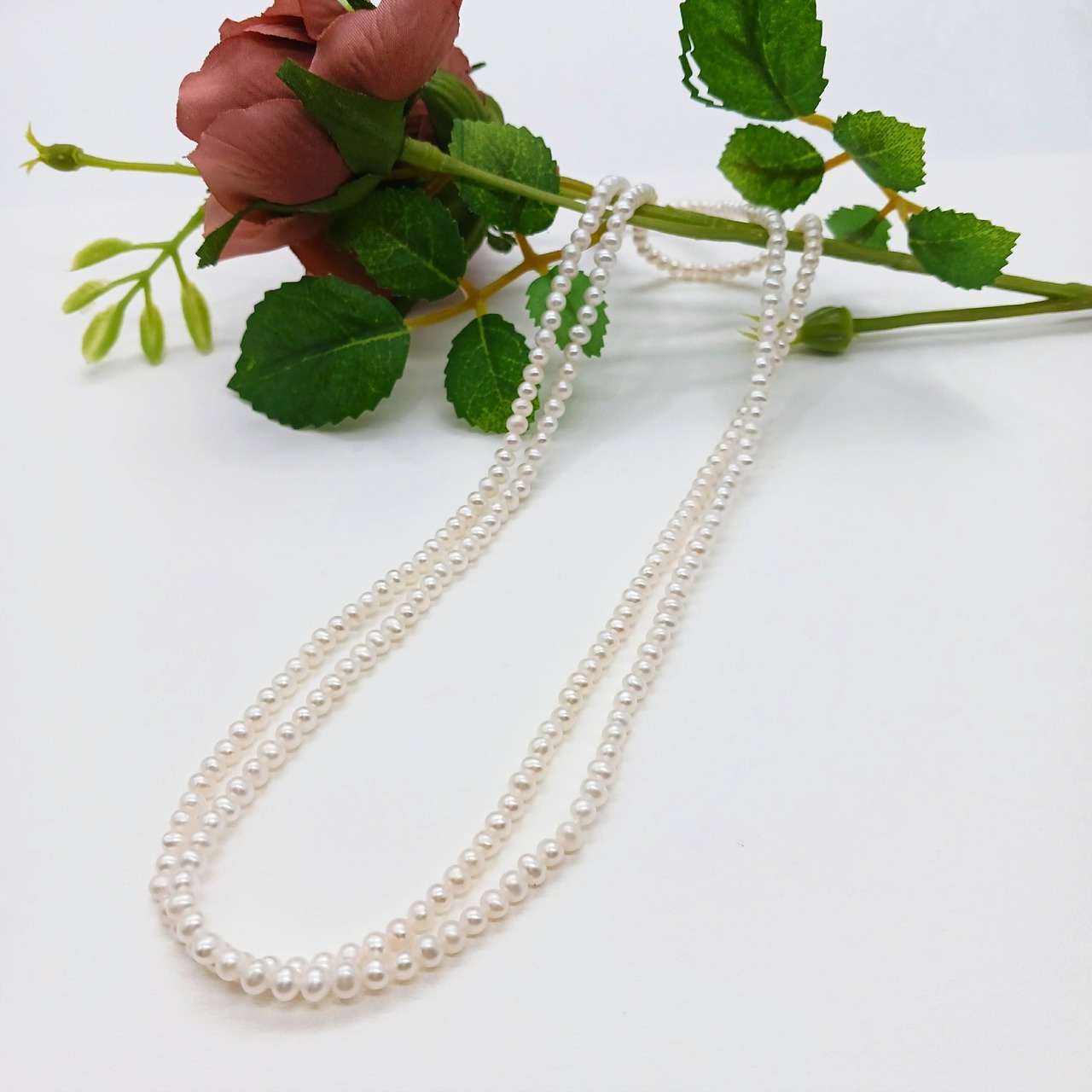 照りの良い小さな淡水真珠の連2本分で作製したロングネックレスです。