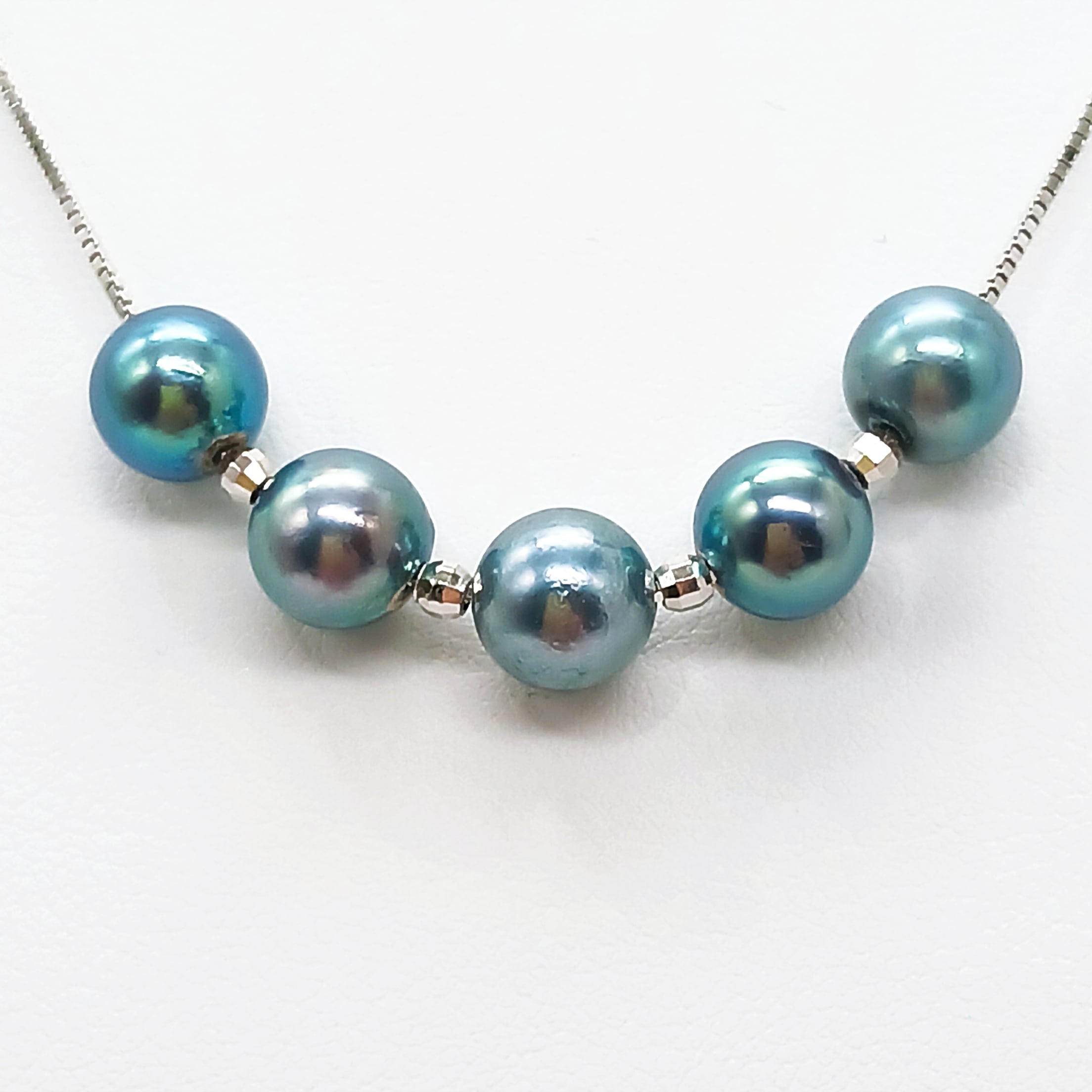 真珠と真珠の間にロジウムコーティングされたシルバーのミラーボールを入れています。