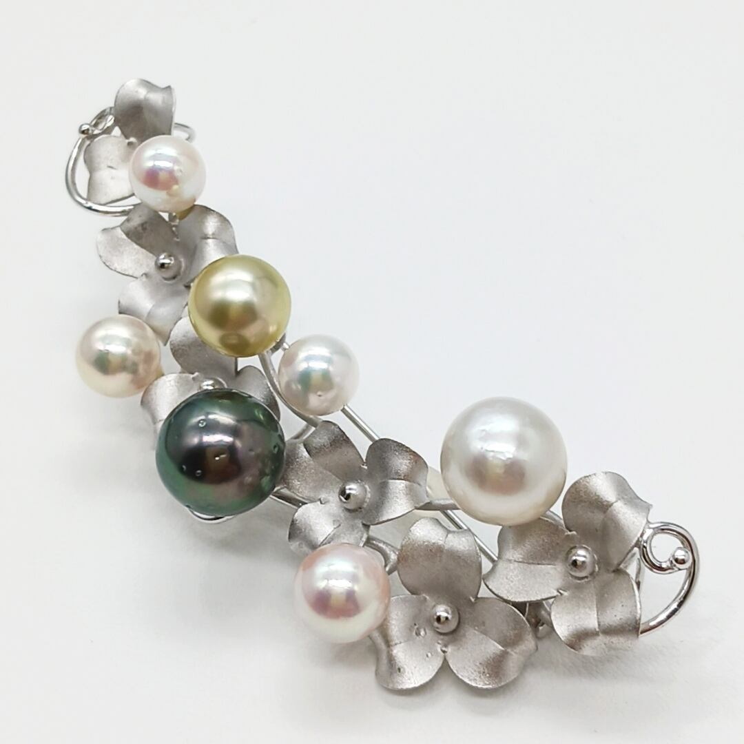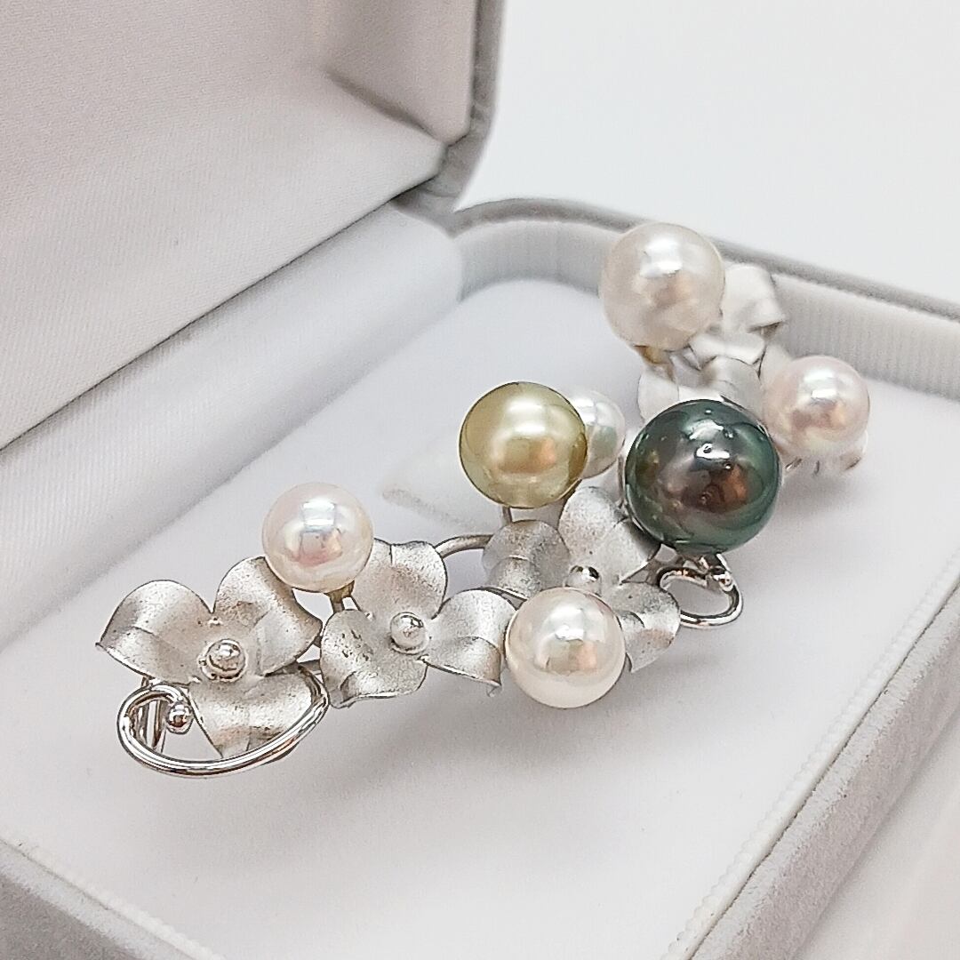 あこや真珠と南洋真珠が計7珠付いた華やかなブローチです。