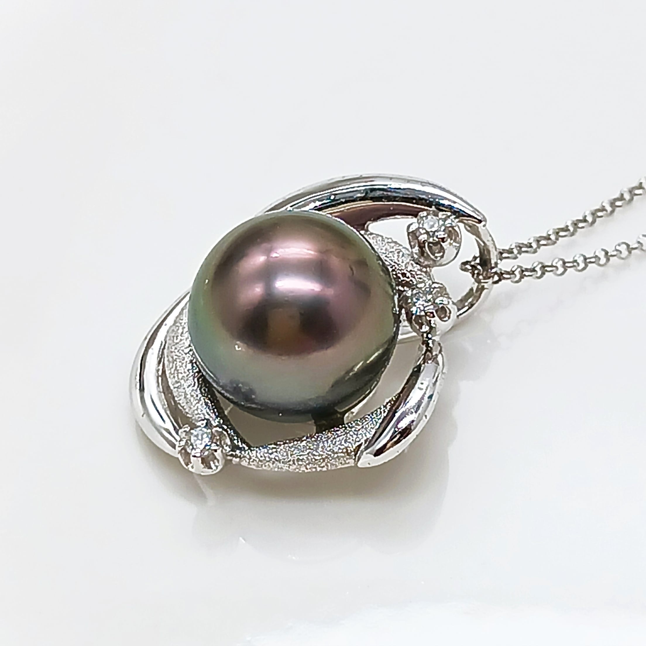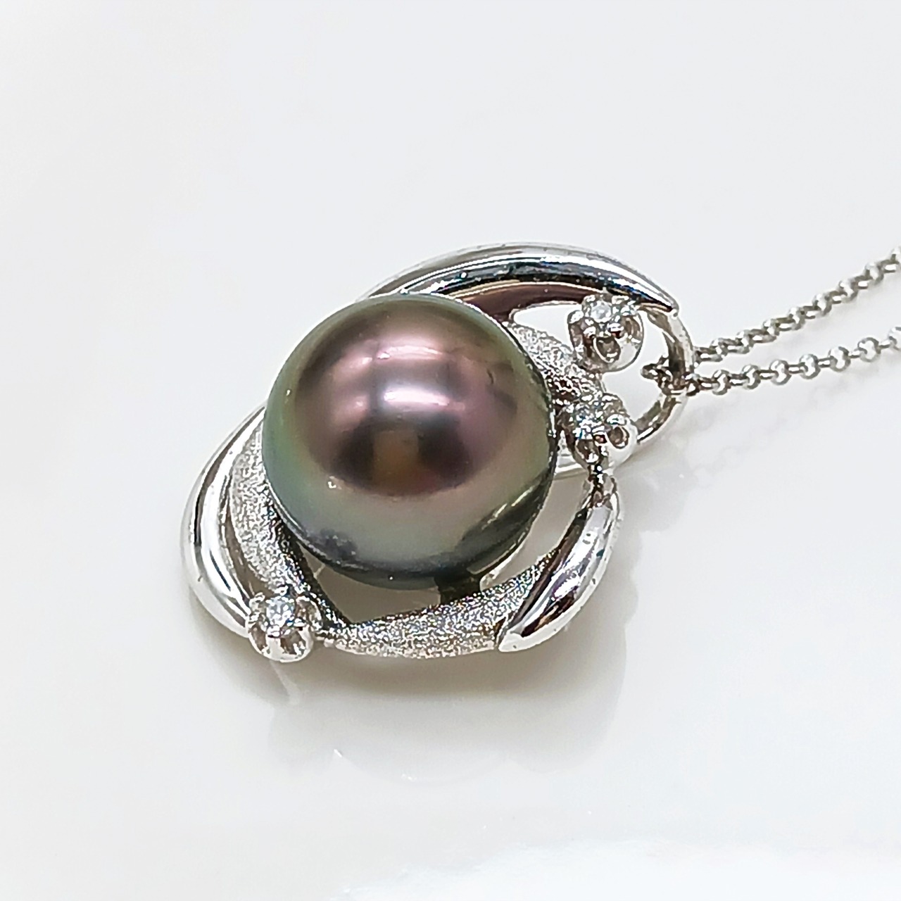 南洋黒蝶真珠の周りに3粒のダイヤモンドが付いた