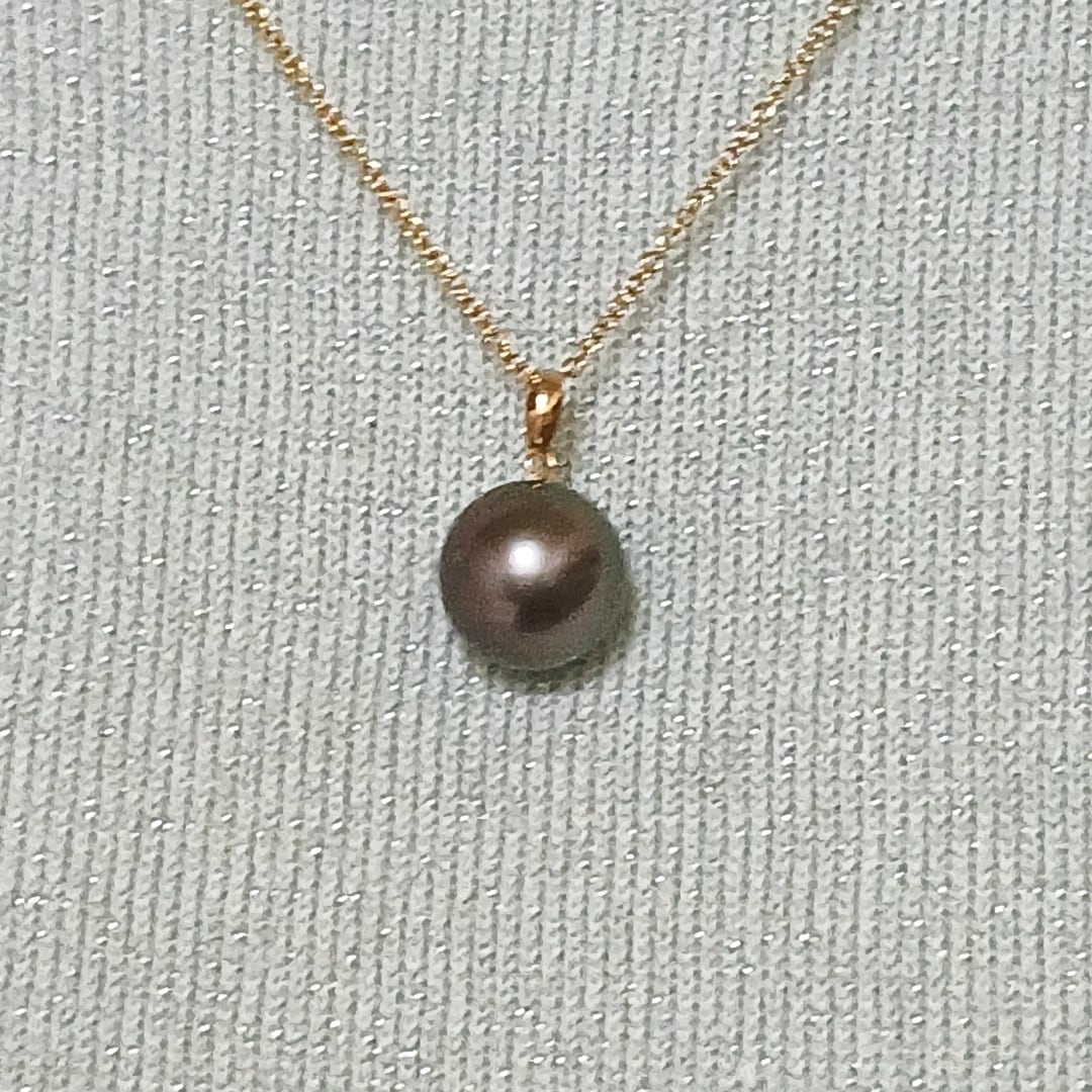 ステンレスチェーン付きK10南洋黒蝶真珠ペンダント・12、3ミリ珠(商品番号13-721)