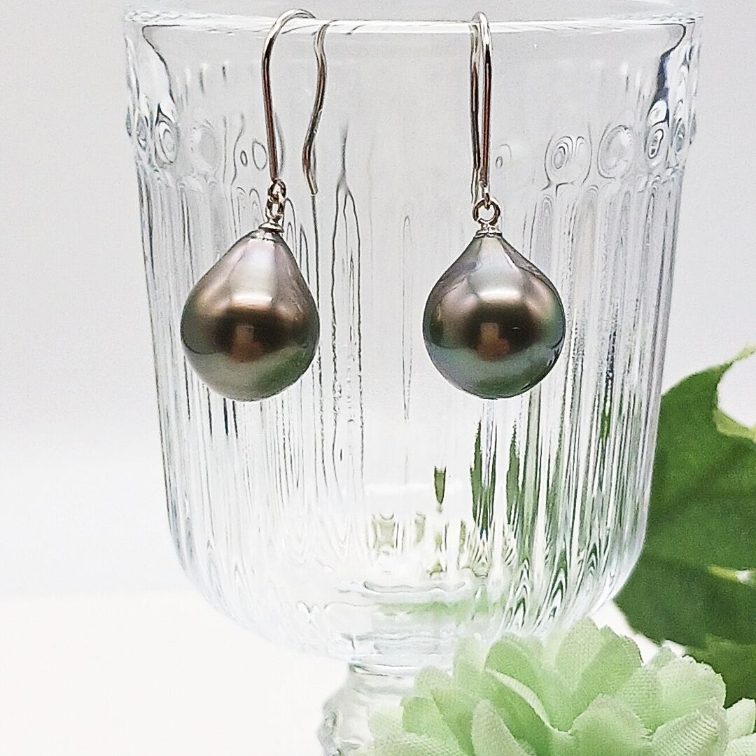 K14WG雫型南洋黒蝶真珠フックピアス・横幅10、6ミリ(商品番号13-722)