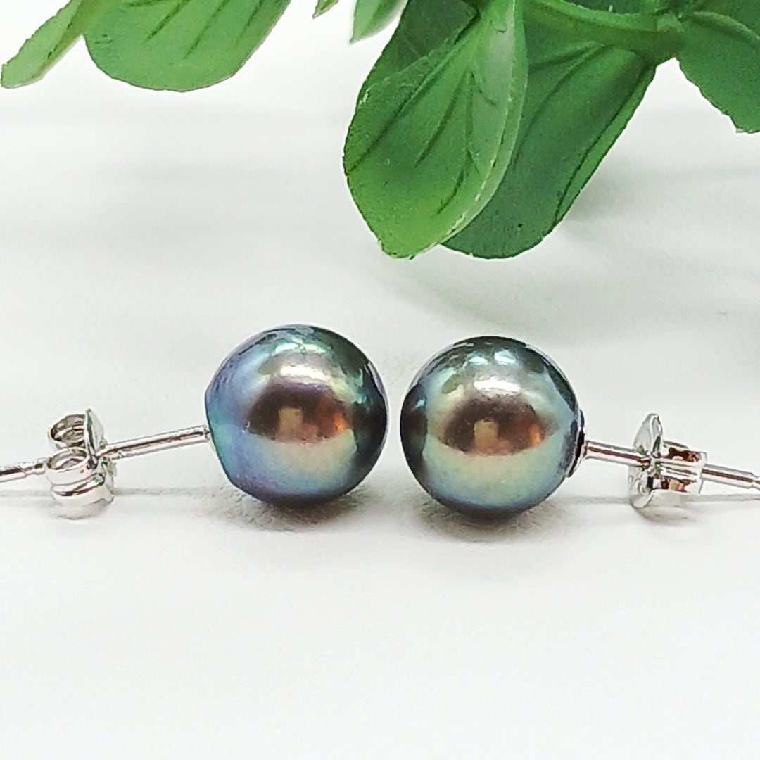 黒蝶真珠のような色目の照りの良いあこや真珠のスタッドピアスです。