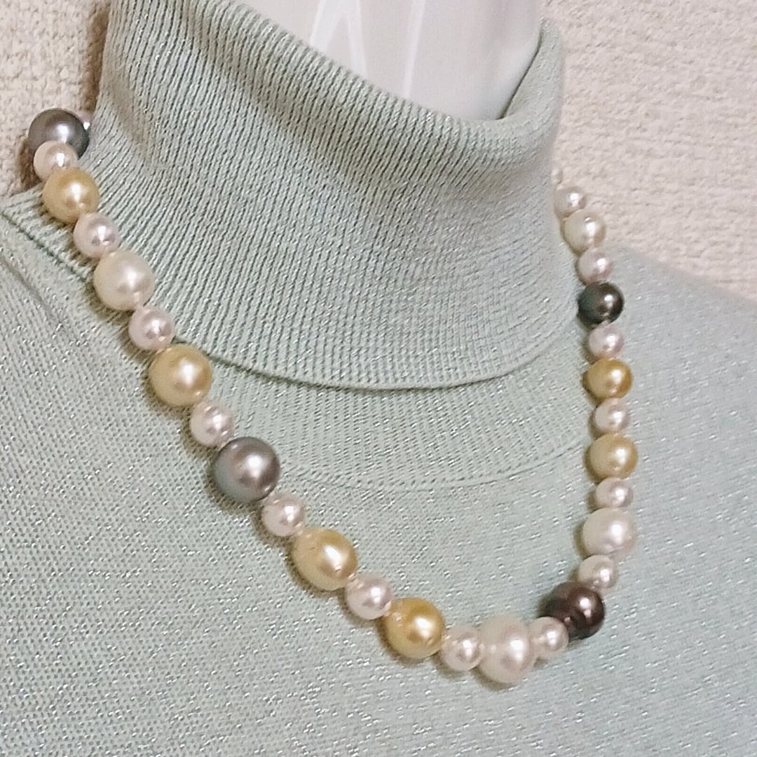 あこや真珠・南洋黒蝶真珠・南洋白蝶真珠の3種類で作製したネックレスです。